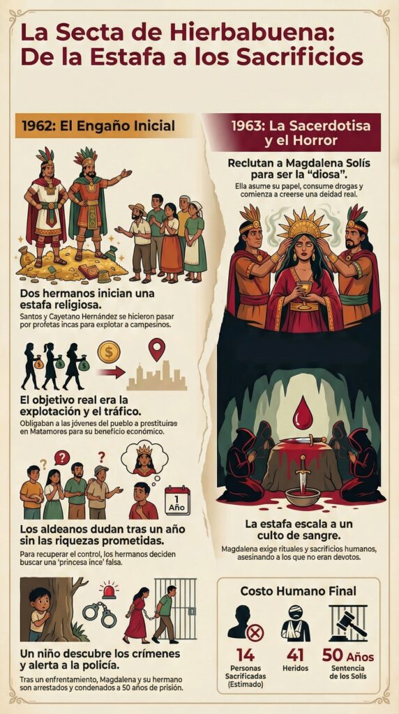 Entran en escena Santos y Cayetano Hernández. Dos hermanos que no eran genios criminales, sino estafadores de poca monta que vieron una oportunidad de oro. Llegaron al pueblo con un cuento chino (o mejor dicho, inca): decían ser profetas de dioses antiguos que vivían en las cuevas cercanas.1